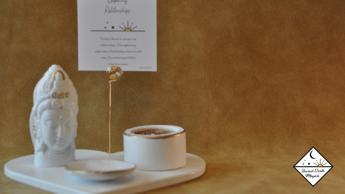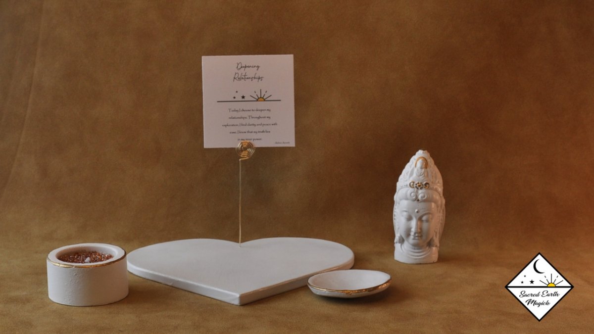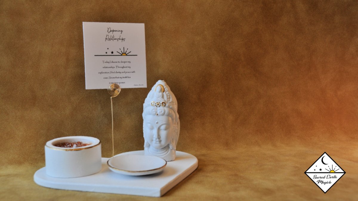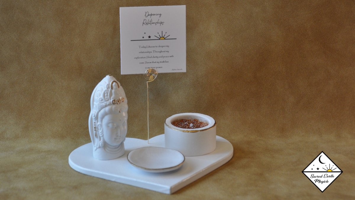 With an intricate spiral design, the card holder completes the set offering a special place for the 7 mantra cards that are included. Written by Ashima Ananda these cards help you to set your focus and set clear intentions for your ritual altar experience.